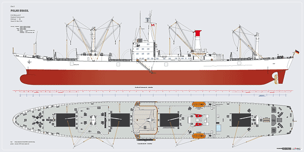 1. Linienriss 2. Steuerbord-Seitenansicht (auf See) mit Gesamtdraufsicht 3. Backbord-Seitenansicht (im Hafen) 4. Decksdraufsichten und Decksmaschinen